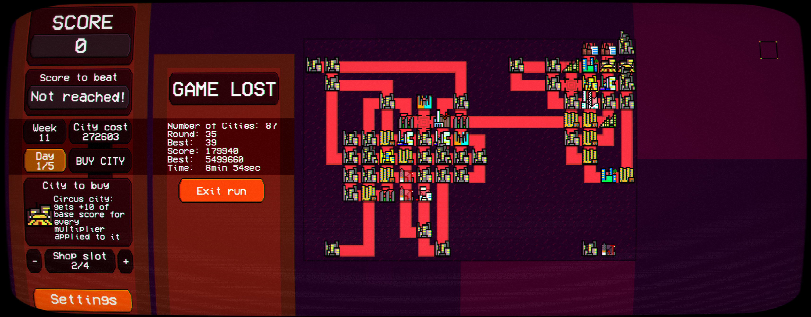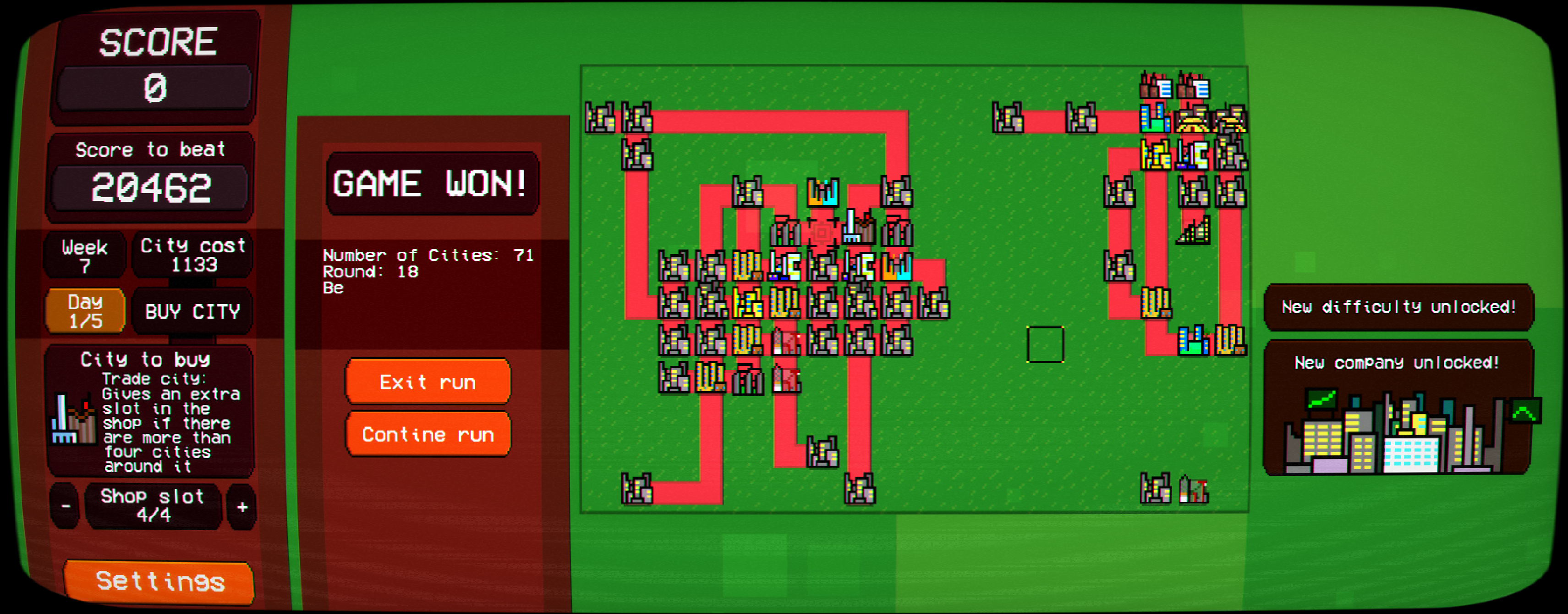 Hello! This is a prototype of a rougle-like puzzle game where you build cities and connect them with ralroads! For now there is a totoal of 22 different cities and objects, the (final game will have around 50 to 60).